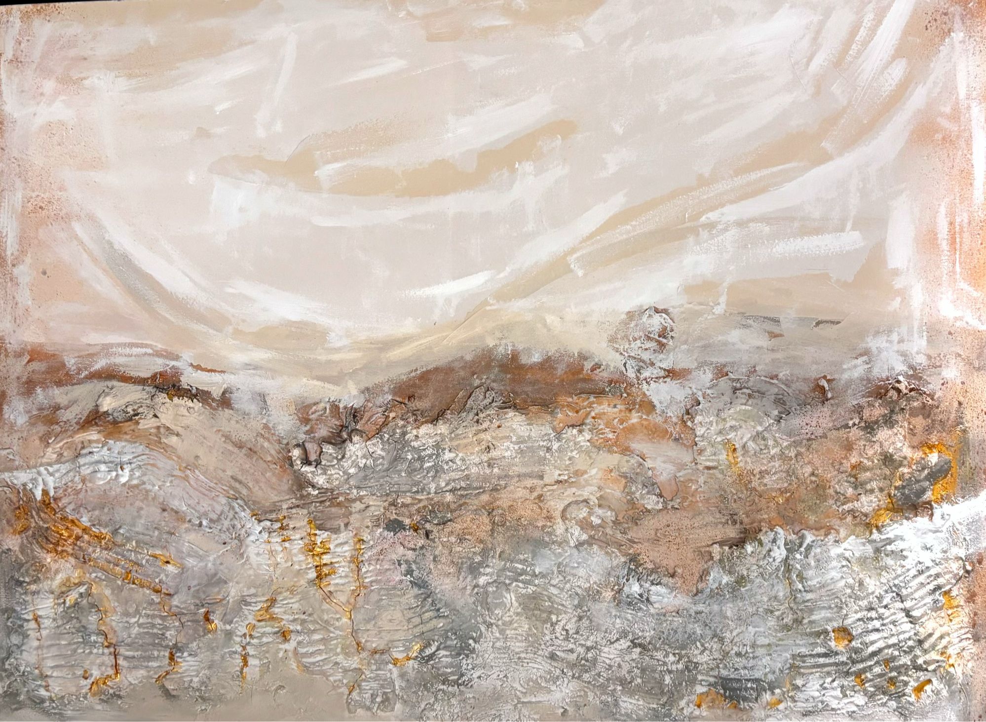“Golden Mountains” is a unique painting in shades of white and cream, enriched with gilded accents embedded in deep texture, evoking the feeling of a three-dimensional mountain landscape. Its sculptural character transforms it from mere decoration into a true aesthetic experience, bringing luxury and elegance to any interior. Perfect for modern apartments, prestigious offices, or designer hotel spaces, “Golden Mountains” turns any room into a space of refined style and distinctive character.