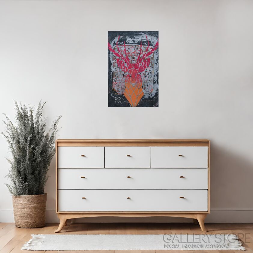 Obraz plakatowy , zaskakujący, nowoczesny. Jeleń namalowany w sposób szablonowy, tło rozpływające się, niespotykane i błyszczące. Obraz średniej wielkości za to oprawiony w szeroką na 6 cm drewnianą ramę w szarym kolorze.