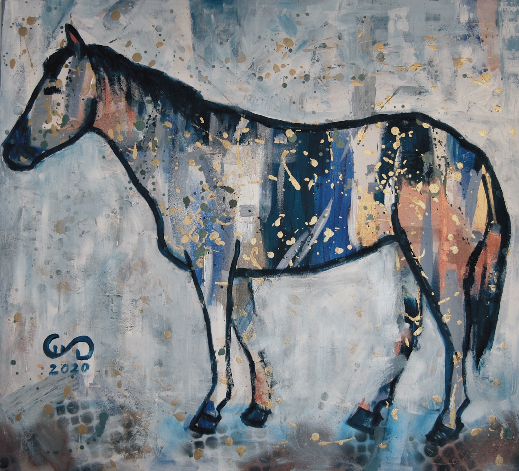 Jeden najnowszych tegorocznych obrazów namalowanych przez artystkę. Zwierzęta to często powracający temat w malarstwie. To niezależne zwierzę zostało pokazane w sposób nieco abstrakcyjny. Nie ma konkretnych konturów, możemy zauważyć różne linie budujące jego szkielet. Praca ta namalowana jest farbami akrylowymi z użyciem pasty strukturalnej oraz spreyu. Dzięki temu obraz jest bardzo przestrzenny i zaskakujący. Niektóre fragmenty błyszczą złotem, a inne są mocno chropowate jakby coś przykleiło się do podobrazia. Praca nie wymaga ramy, boczne krawędzie płótna zostały zamalowane. Praca ta może ożywić wnętrze salonu czy sypialni, z pewnością nada indywidualny charakter każdemu pomieszczeniu. Z pewnością będzie designerskim akcentem mieszkania poprzez neutralne szarości i modny akcent niebieskich odcieni. Praca opisana na odwrocie imieniem, nazwiskiem , znakiem autorskim, pełnym opisem oraz datą.