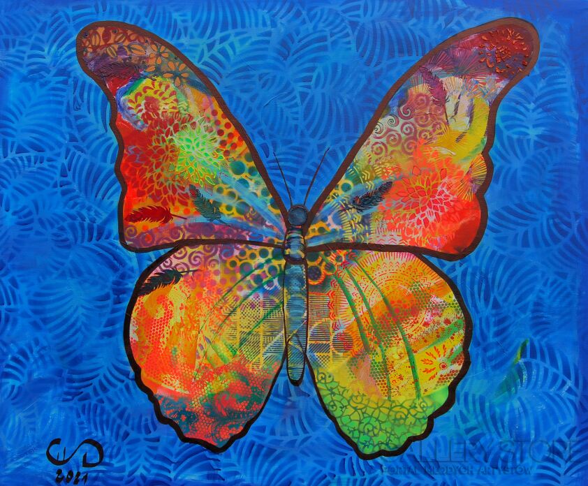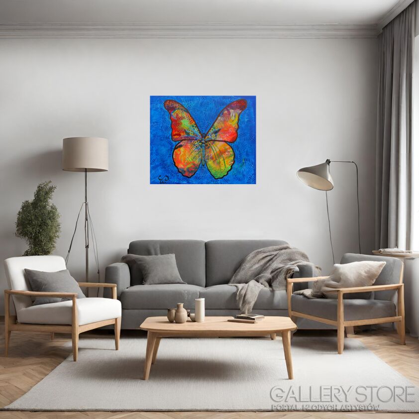 Wielki kolorowy obraz na płótnie dominujący nad wnętrzem. Pełen energii i koloru. Możemy na skrzydłach przedstawionego motyla zaobserwować różne rodzaje nie tylko wzorów, ale i faktur. Artystka wykorzystuje spreye, szablony, szpachle i inne do urozmaicania dzieła. Tak duża praca będzie pięknie prezentować się w salonie czy sypialni. Jest to obraz dla ludzi ceniących przyrodę oraz energiczne kolory. Obraz może się stać miłym prezentem. Jest już gotowy do zawieszenia, ma zamalowane boki.