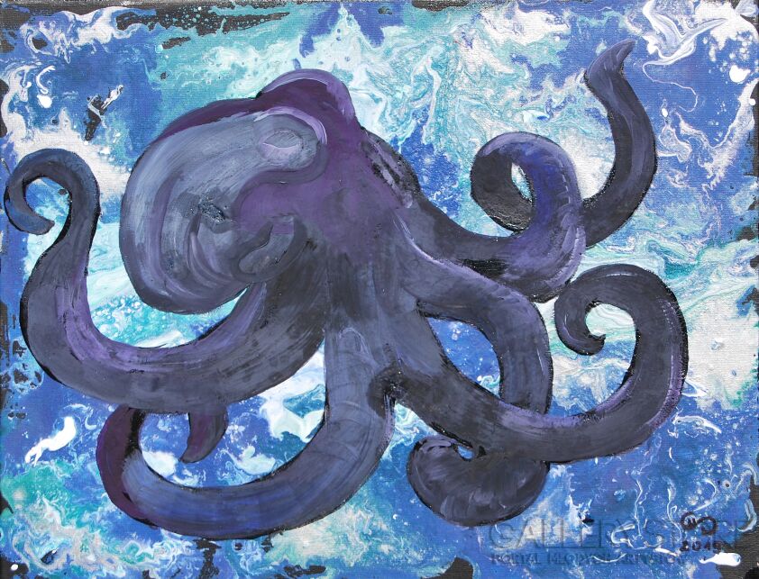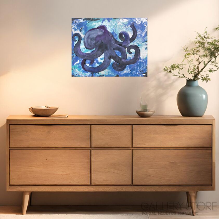 Ośmiornica ukazana w nietuzinkowy sposób. Dla odmiany zamiast widzieć głowny temat obrazu to obserwujemy bardziej cień czy zarys ośmiornicy . Za to główne skrzypce gra tło obrazu czyli morze. W nim dzieją się cuda. Miga nam po oczach i rzeczywiście można poczuć jakby się poruszało. Praca nie jest wielkich rozmarów za to dodatkowo oprawiona w szeroką na 6 cm drewnianą ramę, pomalowaną w szarym kolorze.