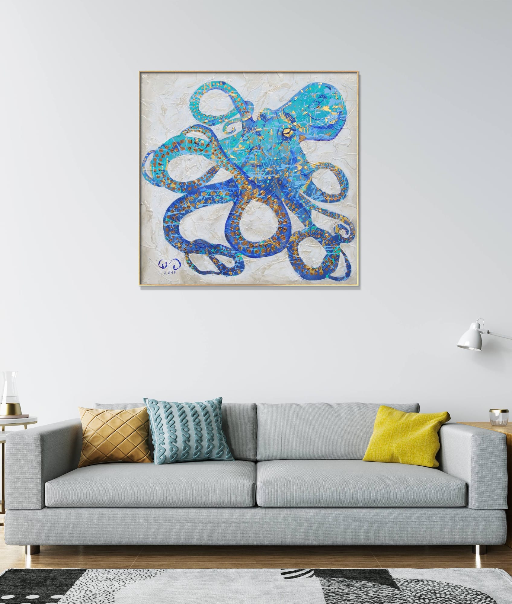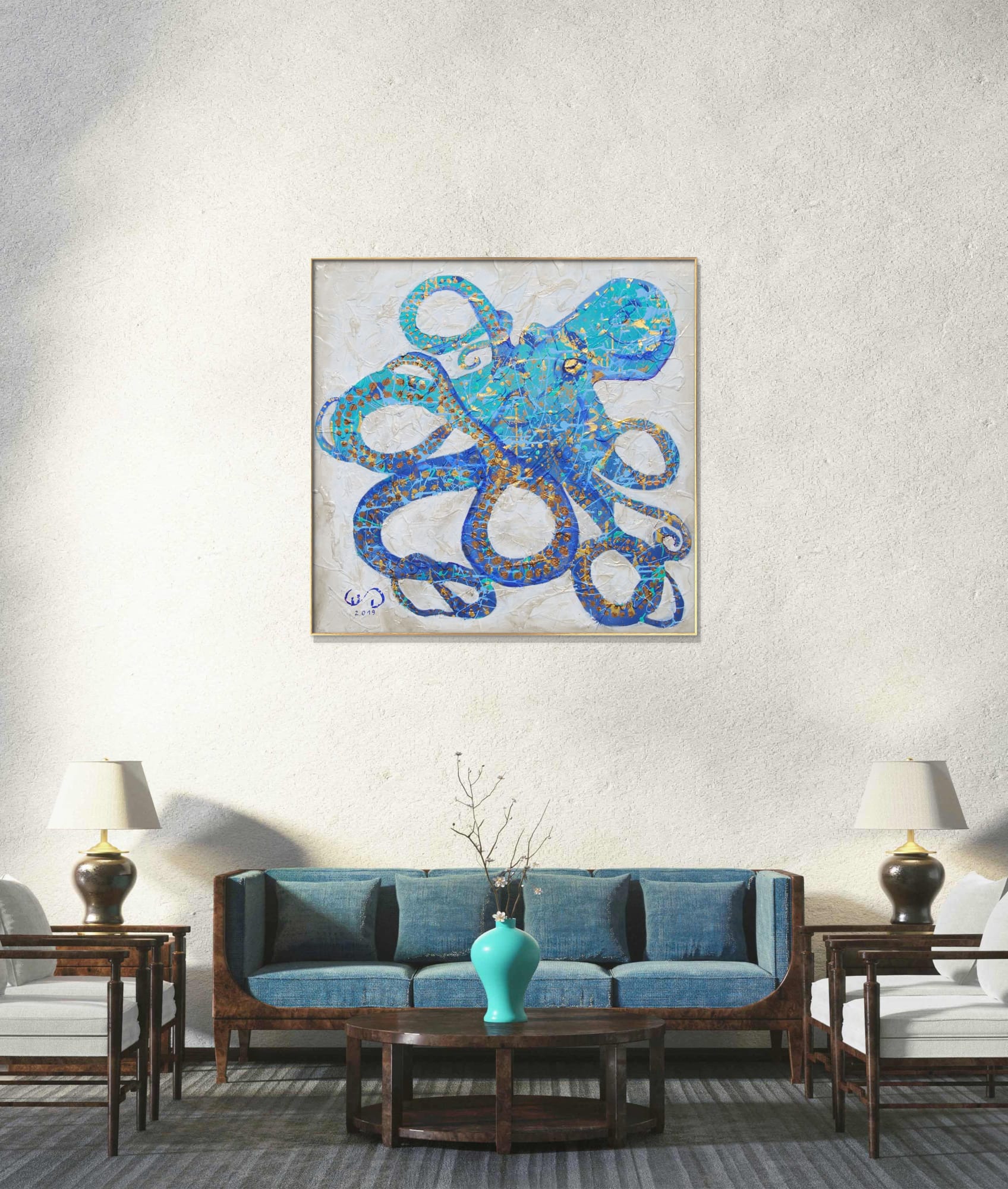 Ośmiornica ukazana w nietuzinkowy sposób. Dla odmiany zamiast widzieć głowny temat obrazu to obserwujemy bardziej cień czy zarys ośmiornicy . Za to główne skrzypce gra tło obrazu czyli morze. W nim dzieją się cuda. Miga nam po oczach i rzeczywiście można poczuć jakby się poruszało.