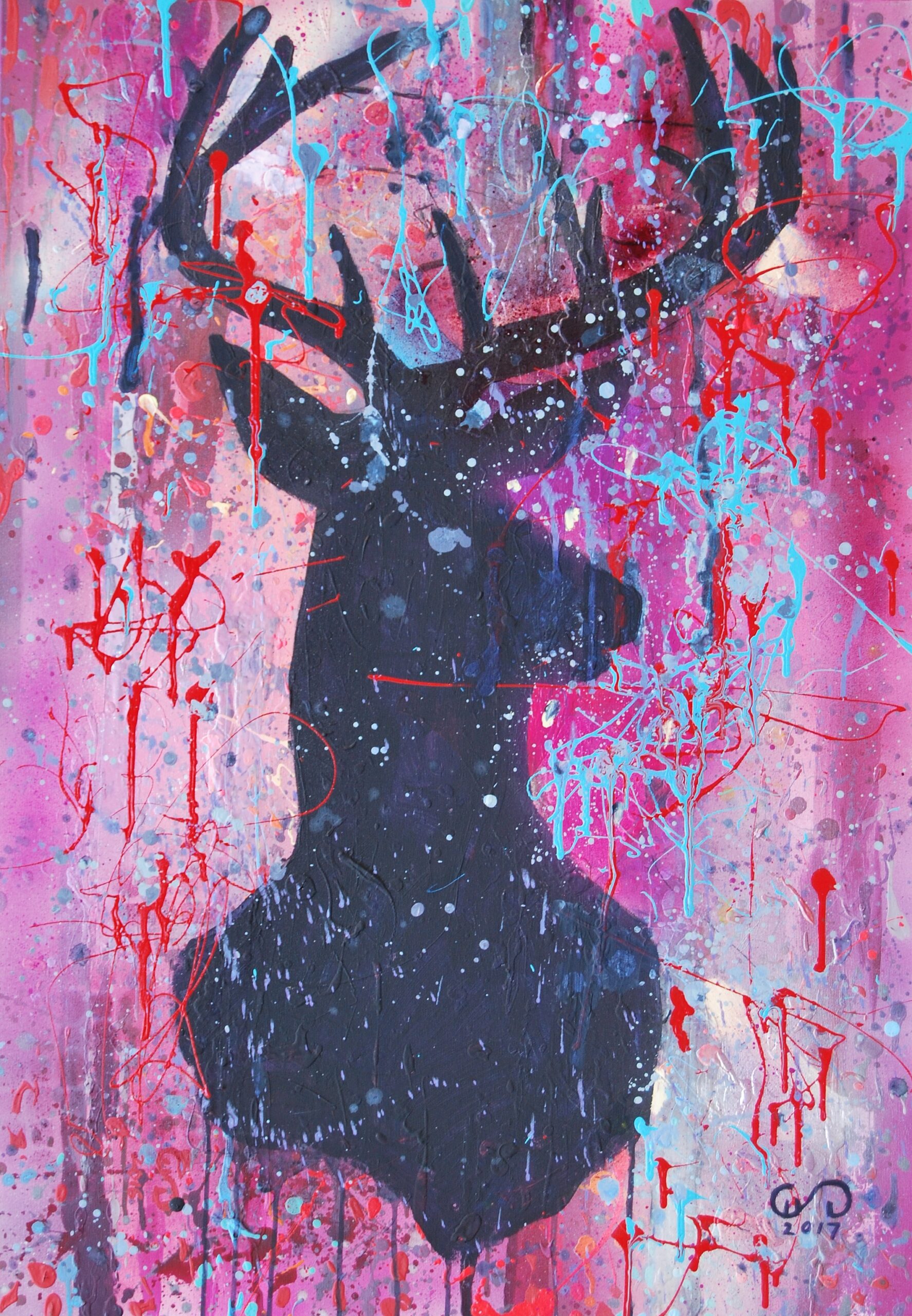 Duży wydruk z pięknymi kolorami. Gęsto malowany farbą akrylową. Pełen energii i koloru. Jelenie, sarny, renifery to piękne zwierzęta. Bardzo dostojne i dzikie. Obraz o tej tematyce jest źle kojarzony przez miliony “jelonków na rykowisku”. Tu autorka pracy pokazuje nam, że można do takiego tematu odnieść się w zaskakujący i niekonwencjonalny sposób. Praca akrylowa w granatach i szarościach, tło w nowoczesnych neutralnych matowych szarościach . Artystka znana jest z różnicowania faktur. I tym razem nas nie zawiodła. Praca jest na płótnie ,miejscami matowa, miejscami błyszcząca, zróżnicowana i oczywiście mocno fakturowa. W prawym dolnym rogu znak autorski. Opisana na odwrocie imieniem, nazwiskiem , znakiem autorskim, pełnym opisem oraz datą. Ten obraz wspaniale uzupełni i ożywi wnętrze salonu, sypialni jak również gabinetu. Boki obrazu zamalowane, jest gotowy do powieszenia.