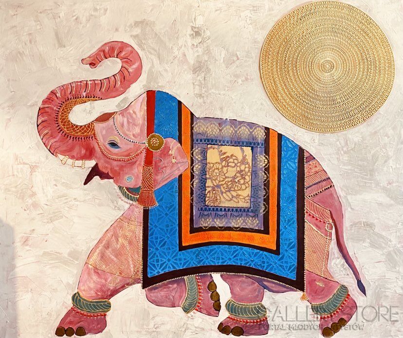 Piękny obraz w stylu indyjskim. Słoń malowany gęstymi impastami , z wieloma przecierkami w różowo brzoskwiniowych barwach z wieloma złoceniami . Przedstawienie go odnosi się do ilustracji książkowych i słoni biorących udział w różnych wydarzeniach. Obraz ten jest pełen złoceń , różnorodnych faktur, od akwarelowych po gęste nakładane szpachelką tło spod którego przenikają brzoskwiniowe błyszczące warstwy oraz złote linie aż odstające od obrazu. Słońce- mandala jest przestrzenne, złocone. Obraz jest częścią cyklu malarskiego, malowanego od wielu lat. Na płótnach artystki pojawiają się różne zwierzęta, w wielu ujęciach. Obraz “Słoń indyjski” może rozjaśnić i ozdobić wnętrze salony, sypialni jak również gabinetu. Paca ta może stać się wspaniałym prezentem dla osób kochających zwierzęta, Indie czy złocenia.