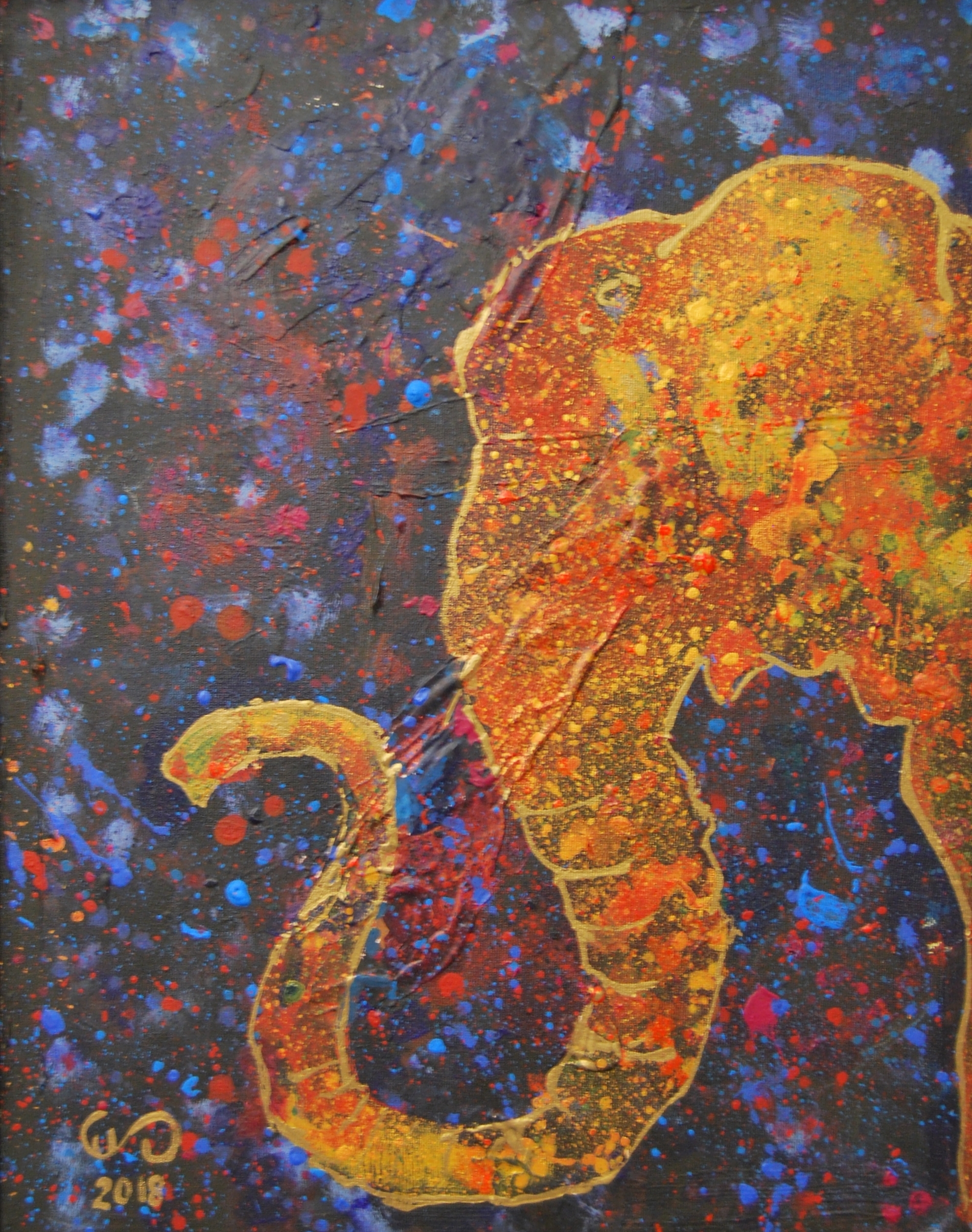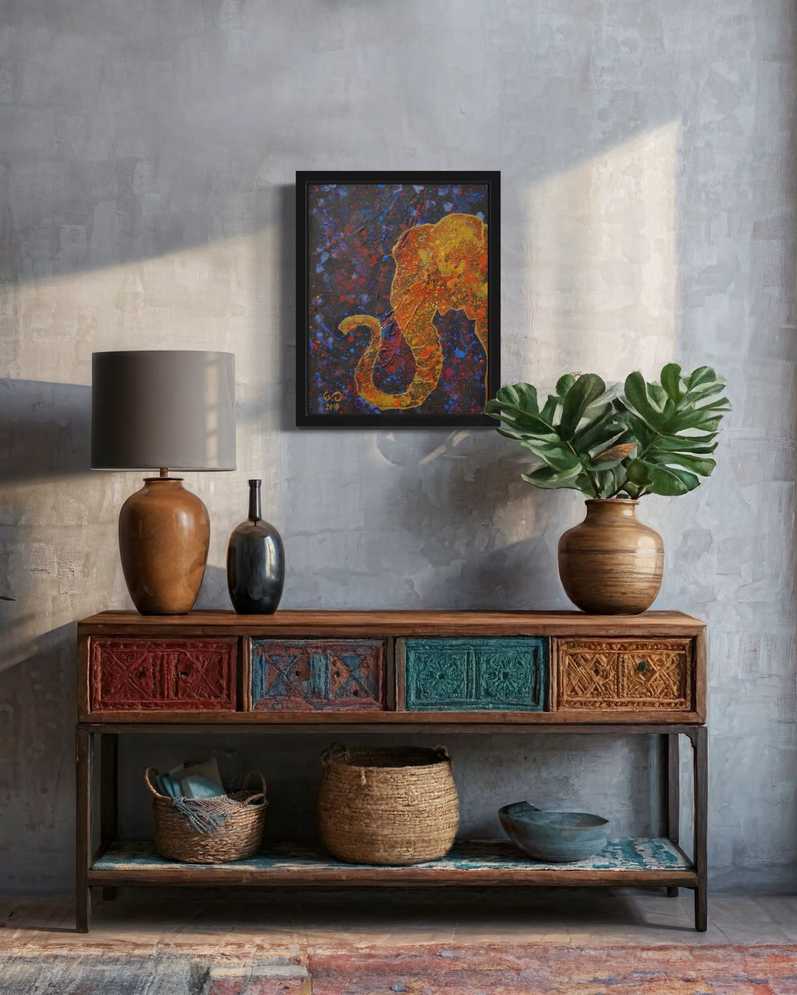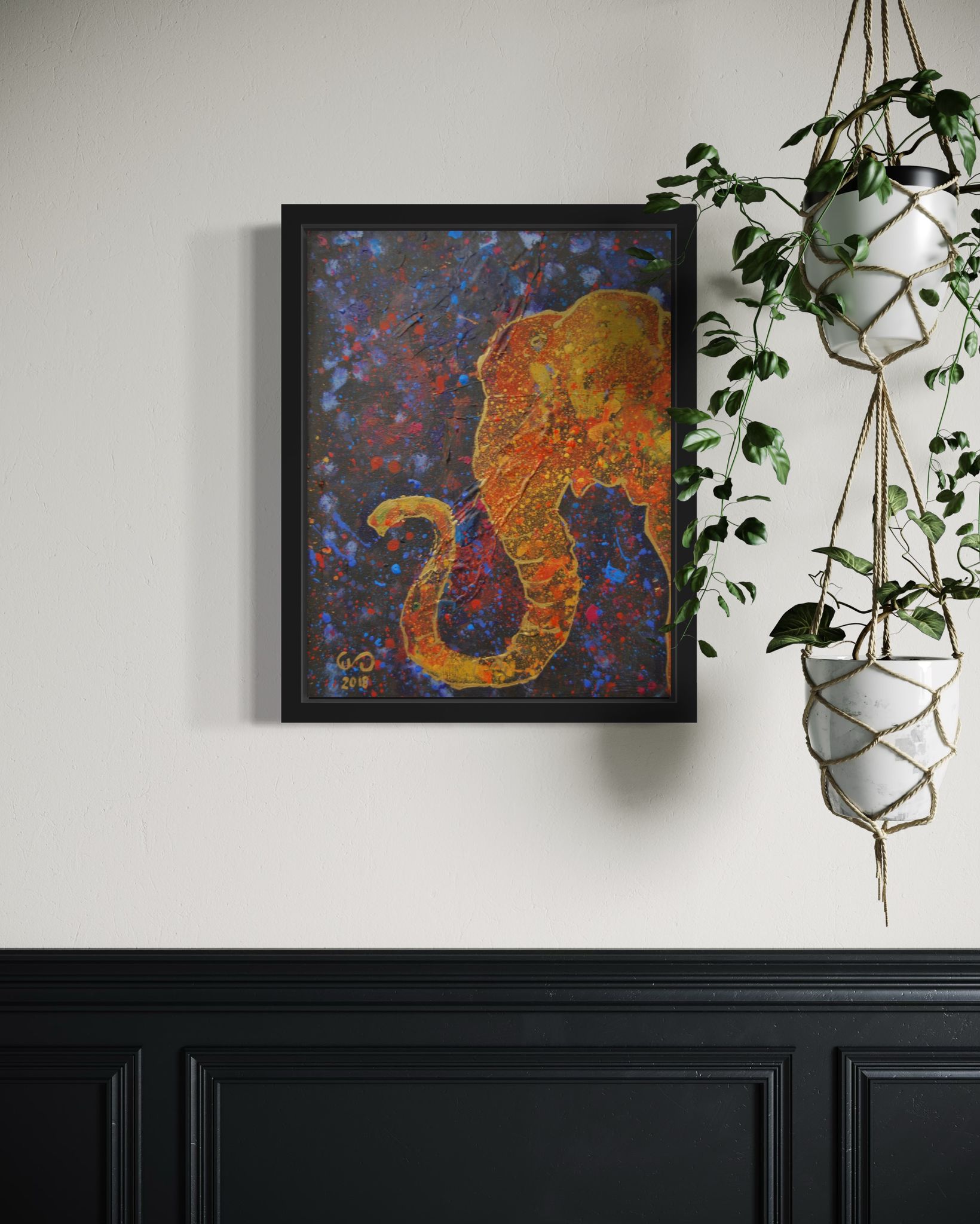 Obraz jest częścią cyklu malarskiego, malowanego od wielu lat. Na płótnach artystki pojawiają się różne zwierzęta, w wielu ujęciach. Obraz “Słoń ” może ocieplić i ozdobić wnętrze salonu, sypialni jak również gabinetu. Paca ta może stać się wspaniałym prezentem dla osób kochających zwierzęta, Indie czy złocenia.