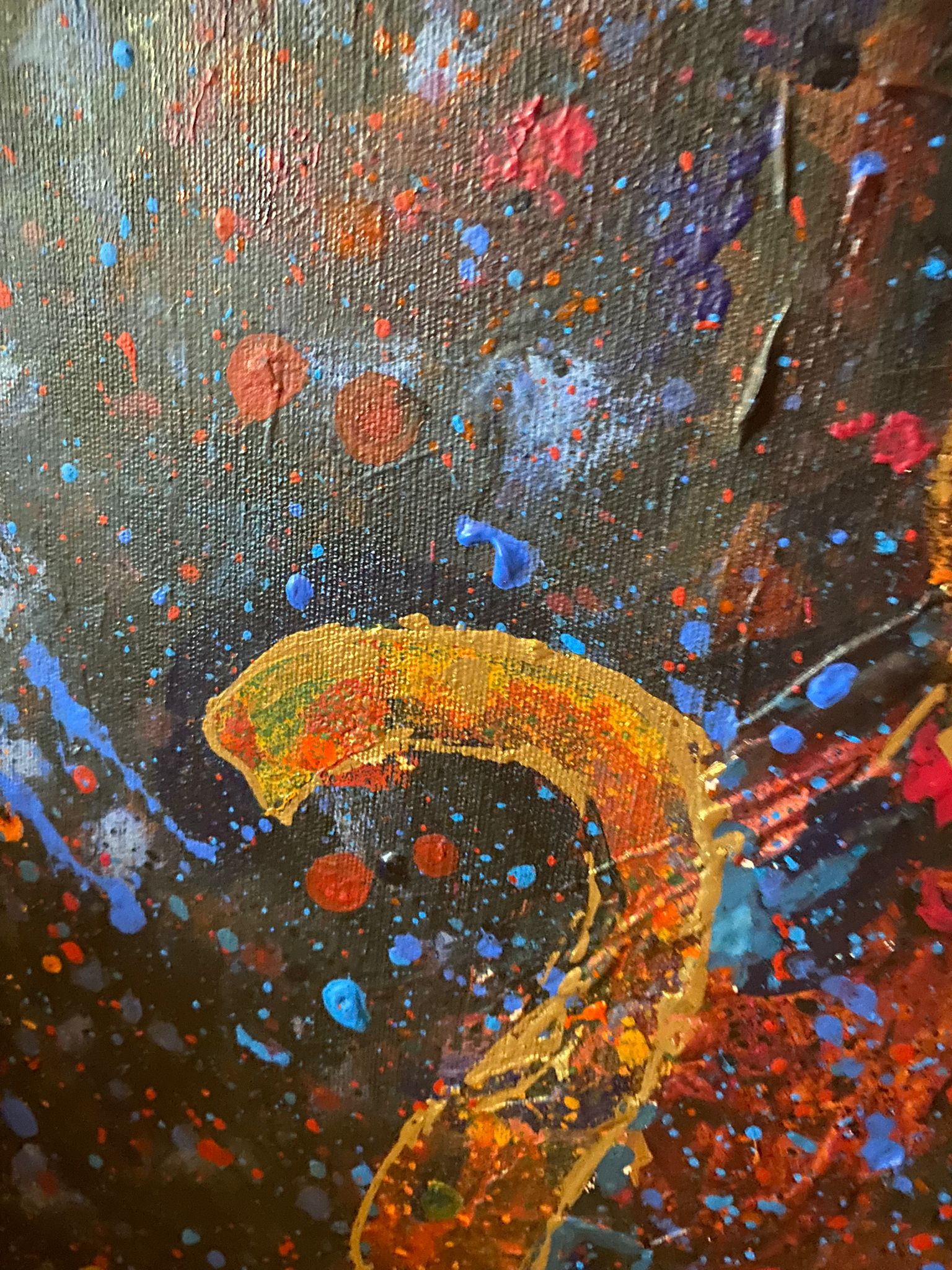 Przedstawienie go odnosi się do ilustracji książkowych i słoni biorących udział w różnych wydarzeniach. Obraz ten jest pełen złoceń , różnorodnych faktur,tło granatowe, całe wibrujące.