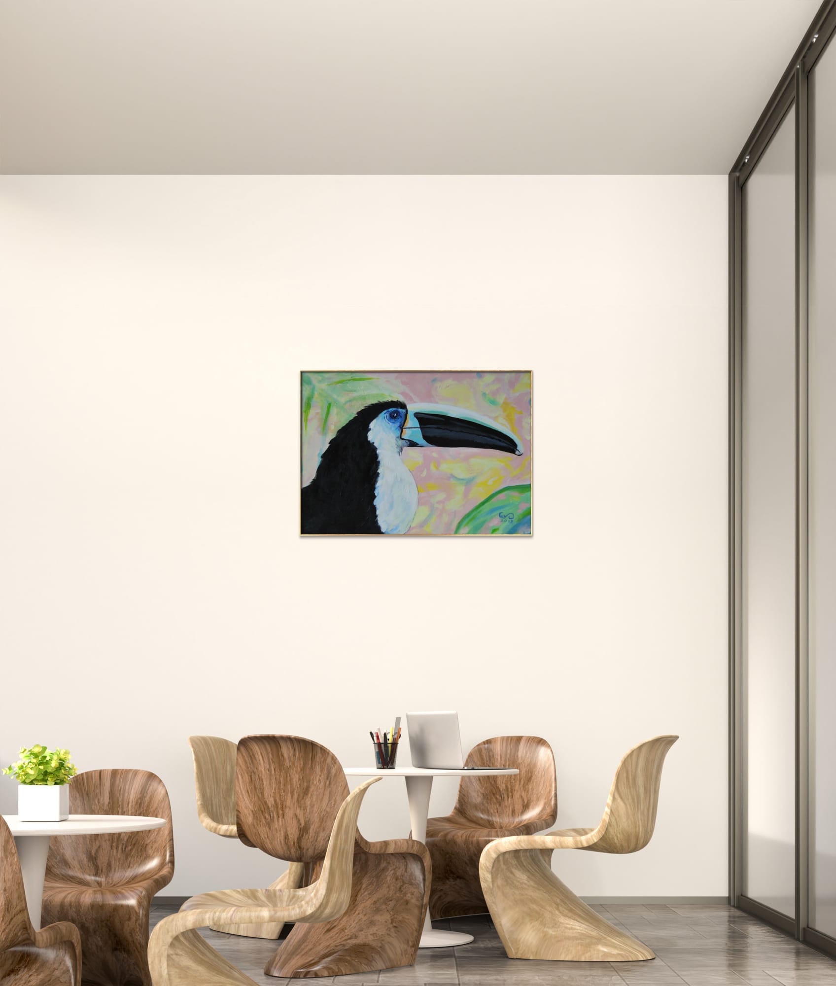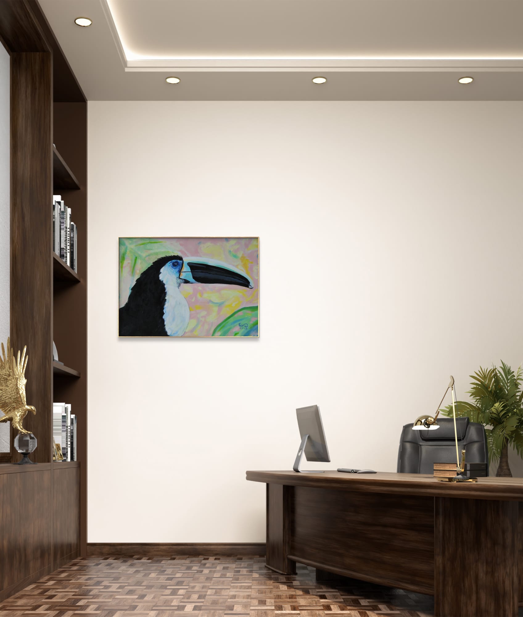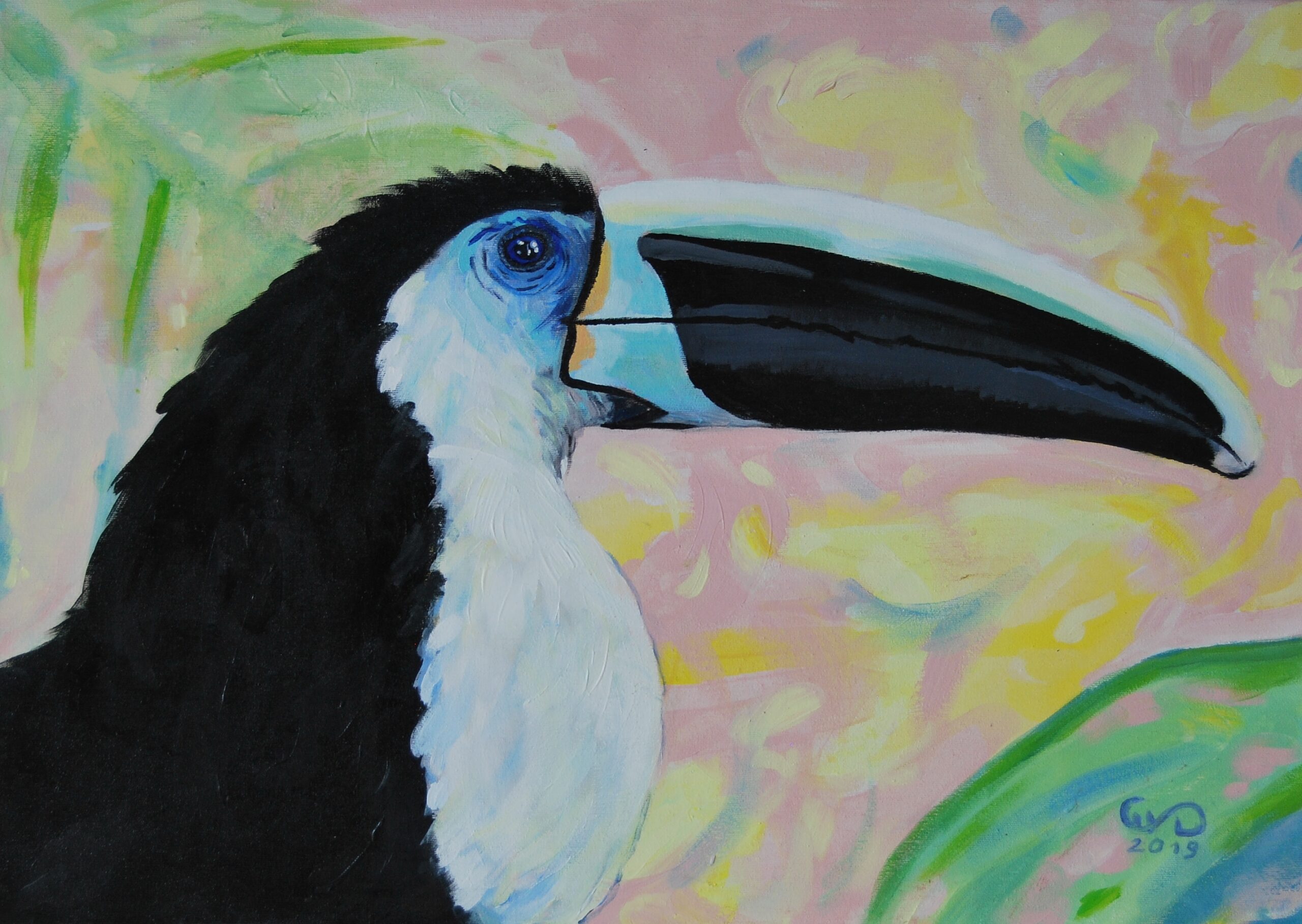 Piękny portret tukana czarnodziobego o niesamowitym spojrzeniu. Ubarwienie ultramarynowe wokół oka jest punktem najbardziej intensywnym obrazu. Tło dodane delikatne, ciepłe i słoneczne jak przez filtr aparatu, który rozmywa niepotrzebne otoczenie i prowadzi nasz wzrok ku pikęknemu ptakowi. Kolorystyka pracy jest niecodzienna dla artystki, która zwykle używa intensywnie kontrastujących barw i grubych faktur. W tej pracy widzimy wyciszenie i spokój, delikatną radość. “Tukan czarnodzioby” jest w formacie 50x70cm także idealnie zmieści się w salonie czy pokoju. Posiada złotą prostą ramę, która dodaje mu elegancji. Do dziela dołączony jest certyfikat autentyczności. Obraz jest podpisany z przodu znakiem autorskim malarki a z tyłu pełnym imieniem, nazwiskiem, tytułem oraz techniką pracy.