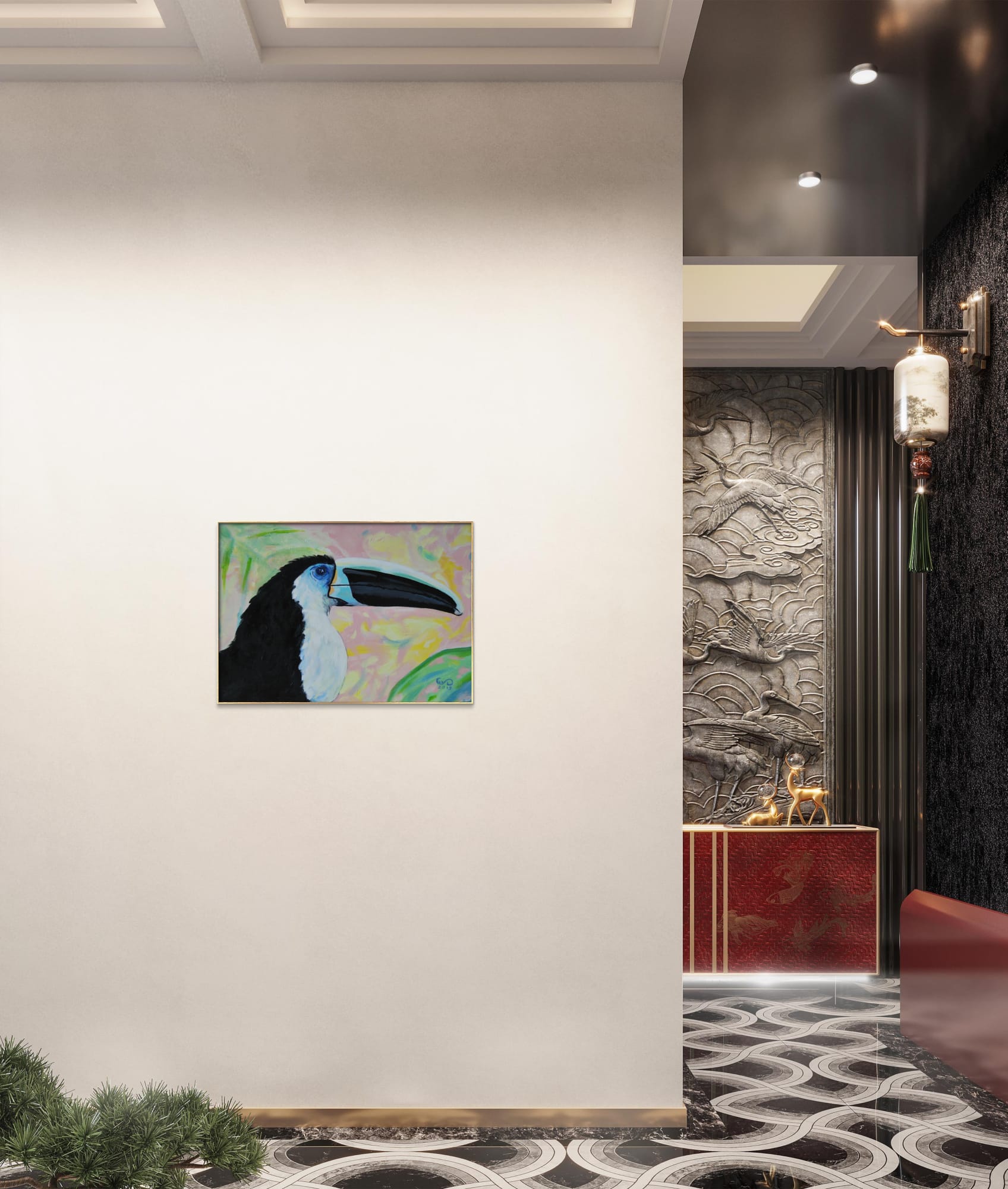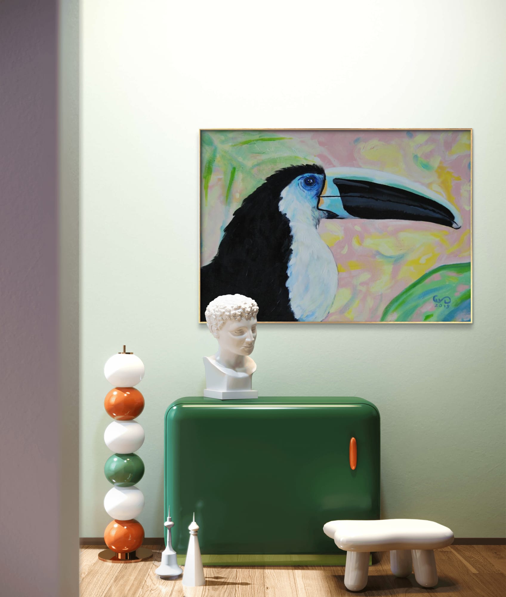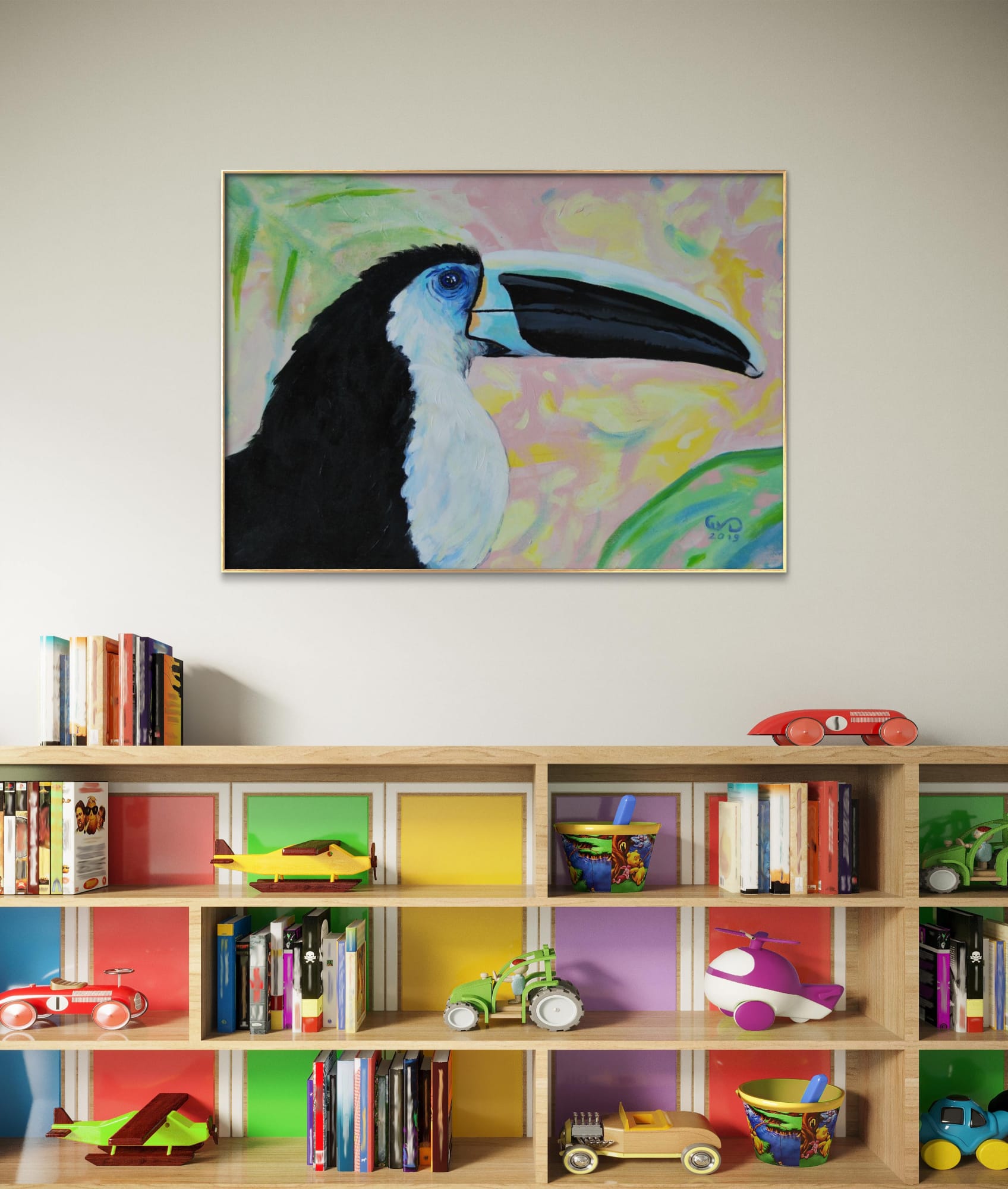 Piękny portret tukana czarnodziobego o niesamowitym spojrzeniu. Ubarwienie ultramarynowe wokół oka jest punktem najbardziej intensywnym obrazu. Tło dodane delikatne, ciepłe i słoneczne jak przez filtr aparatu, który rozmywa niepotrzebne otoczenie i prowadzi nasz wzrok ku pikęknemu ptakowi. Kolorystyka pracy jest niecodzienna dla artystki, która zwykle używa intensywnie kontrastujących barw i grubych faktur. W tej pracy widzimy wyciszenie i spokój, delikatną radość. “Tukan czarnodzioby” jest w formacie 50x70cm także idealnie zmieści się w salonie czy pokoju. Posiada złotą prostą ramę, która dodaje mu elegancji. Do dziela dołączony jest certyfikat autentyczności. Obraz jest podpisany z przodu znakiem autorskim malarki a z tyłu pełnym imieniem, nazwiskiem, tytułem oraz techniką pracy.